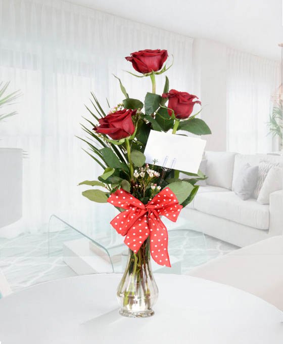 Siempre perfecto es este bonito Ramo de 3 Rosas de nuestra floristería. Regalar tres rosas es el detalle perfecto. Esta confeccionado con 3 rosas de tallo largo y decorado con paniculata, es el regalo perfecto para esa persona especial, e ideal para regalar en cualquier momento, si lo que queremos es enviar rosas rojas a domicilio. Si estás buscando rosas rojas para regalar, nuestros ramos de flores rojas son los ideales. Además, ofrecemos un servicio de envío de flores urgentes Nuestros ramos de rosas, están realizados siempre con flores de primera calidad y frescas. Son suministradas diariamente por proveedores nacionales e internacionales. Los ramos de flores rojas para regalo, están realizados siempre por floristas profesionales, especialistas en el Arte Floral, por lo que siempre presentamos un producto fresco y elaborado con mucho mimo.