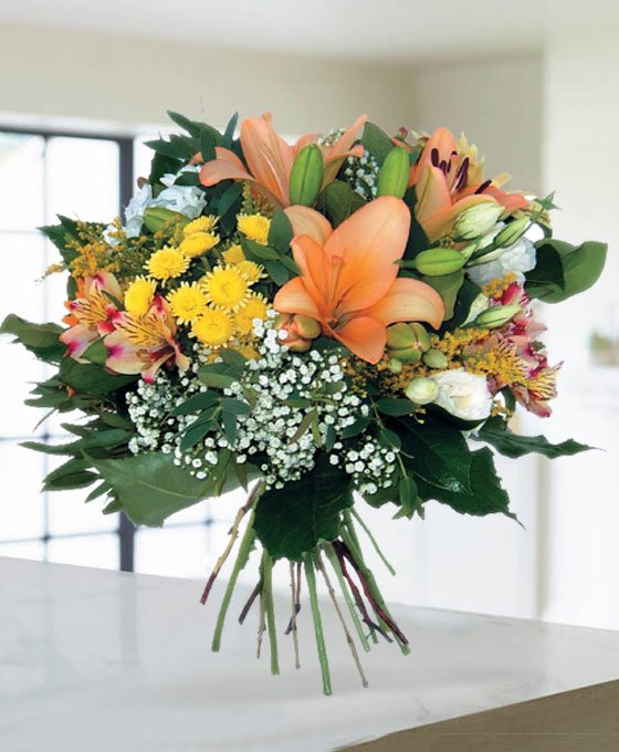 Compuesto por flores silvestres como las margaritas, paniculata, alstroemerias, lisianthums, y también por flores más especiales como es el lilium, realizado con colores otoñales y decorado con bonitos verdes que le dan ese aire tan alegre y bonito, que nos aboca al otoño, que es sin duda una estación de colores especiales.